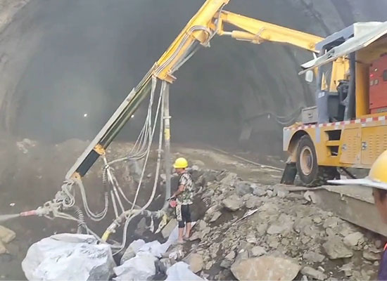 1、大型機械臂濕噴機以其每小時30~40m3的噴射混凝土量,加快施工進度。