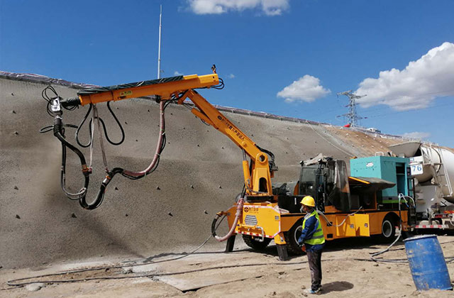 混凝土濕噴機(jī)械手是智能化高適應(yīng)性濕噴混凝土設(shè)備,通過(guò)無(wú)線遙控器操作噴射臂的噴射位置和噴嘴的角度,減少了操作人員與混凝土的接觸,同時(shí)降低了粉塵濃度,改善了作業(yè)環(huán)境,保障了施工人員的身體健康。混凝土濕噴機(jī)械手廣泛應(yīng)用于鐵路隧道、公路隧道、水利涵洞、礦山巷道、堤壩邊坡、建筑基坑和軍事工程等領(lǐng)域施工中的噴射混凝土支護(hù)作業(yè)。